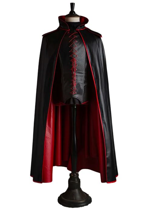 Cape / cloak: Often with a high collar, dramatic draping, or contrasting lining.